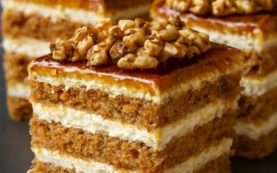 Miodownik z kremem budyniowym i karmelizowanymi orzechami w miodzie