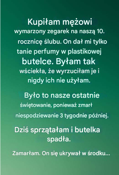 Trzy tygodnie później odszedł. Bez ostrzeżenia, bez czasu na przygotowania – tylko telefon, który wszystko zrujnował. W kolejnych dniach snułam się po naszym domu niczym cień. Jego kubek wciąż stał na blacie. Jego kurtka wisiała przy drzwiach. A w tej szufladzie, nietknięte, leżały perfumy. Za każdym razem, gdy na nie patrzyłam, żal się pogłębiał. Odrzuciłam coś, co dał mi z miłością, i teraz nigdy nie będę miała okazji powiedzieć mu, jak wiele dla mnie znaczył.