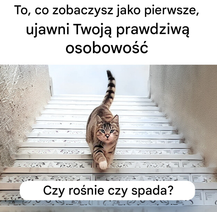 Weźmy prosty i kultowy już przykład z internetu: zdjęcie kota na schodach. Pytanie jest proste: czy ten kot idzie w górę, czy w dół? A jednak, w zależności od odpowiedzi, interpretacja może być zupełnie inna.